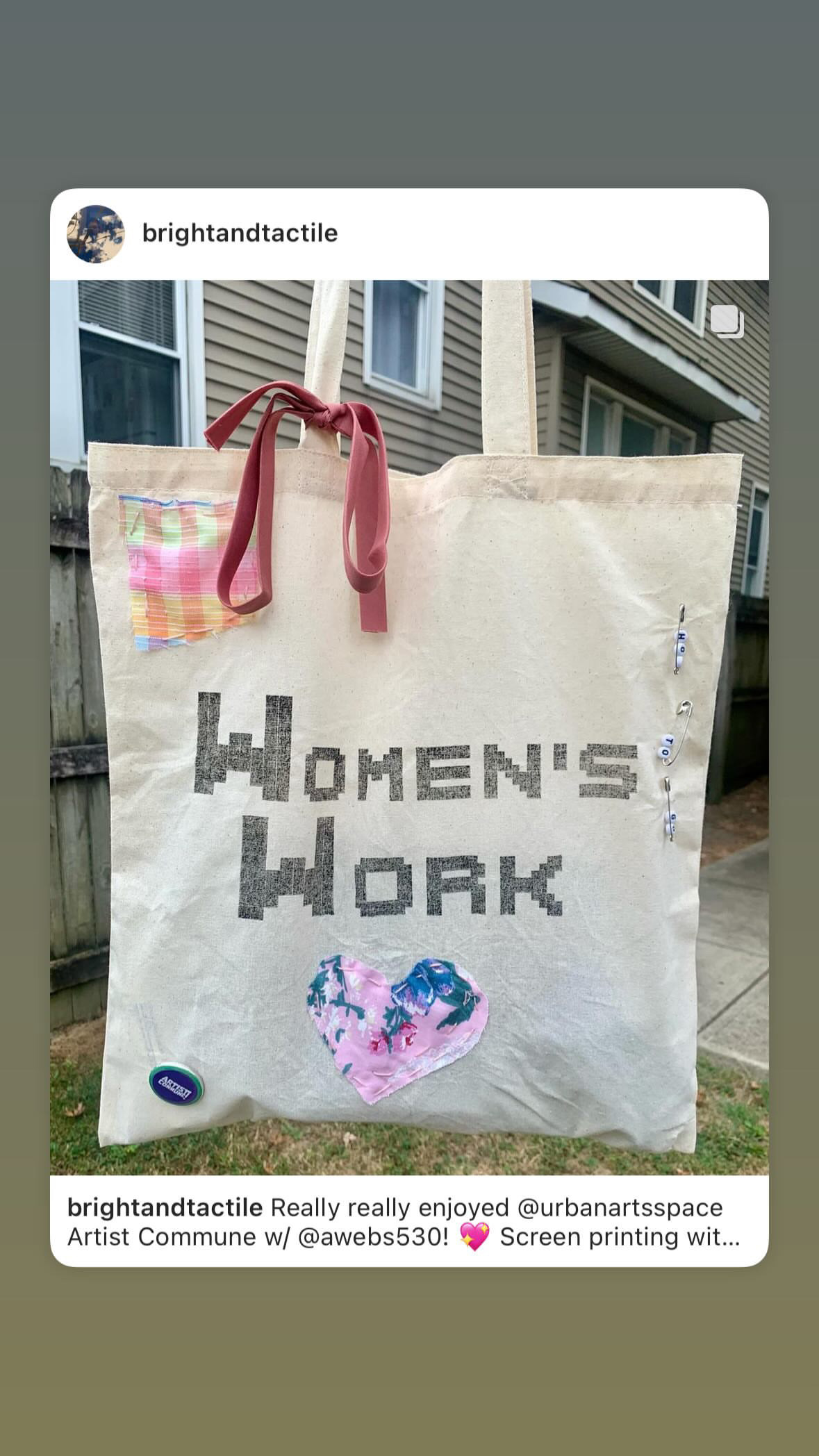 "Totes on Town" achieved record attendance for an Artist Commune workshop, fostering community engagement and interaction with the Women's Work exhibition and the mission of Urban Arts Space. Below, you can explore a selection of images showcasing the marketing resources, event activities, and social media posts that capture the essence of the event.